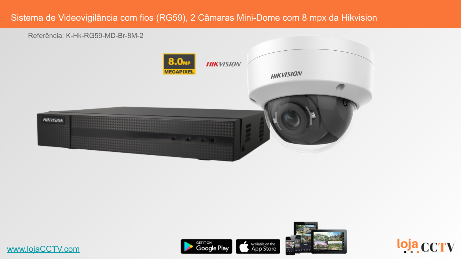 Sistema de Videovigilância com fios (RG59), 2 Câmaras Mini-Dome com 8 mpx da Hikvision