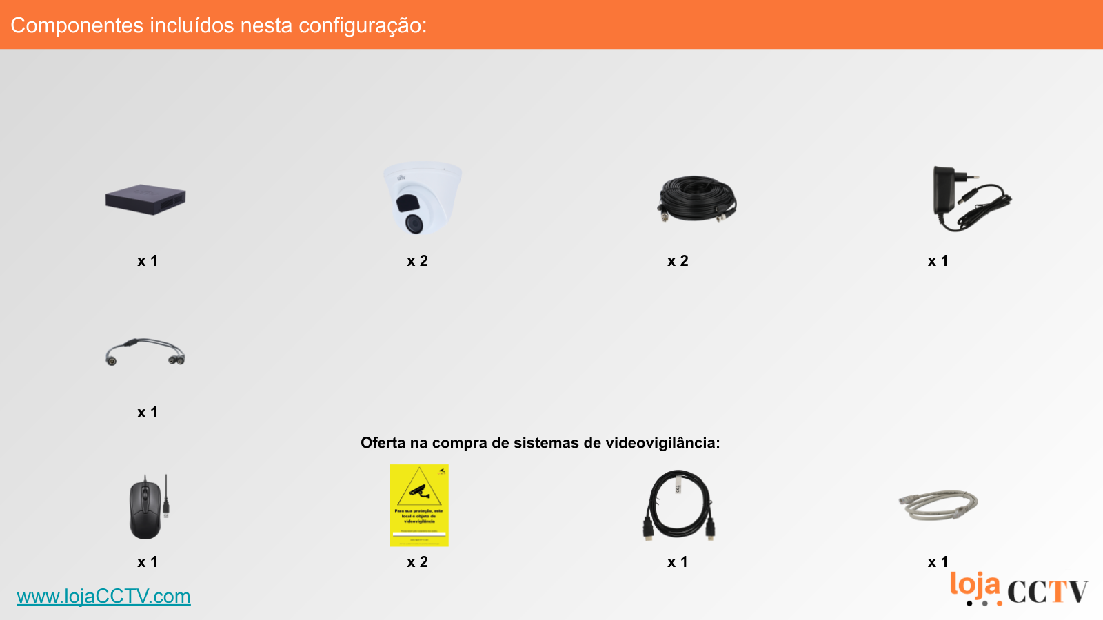 A configuração apresentada é ideal para a sua habitação, loja ou armazém. Com uma resolução de 2 mpx, cada câmara tem qualidade de imagem ideal para cobrir uma área até 25 m². Se tiver áreas superiores, podemos alterar a configuração para incluir uma ou mais câmaras de resolução superior, ou temos outras configurações de sistemas completos disponíveis.