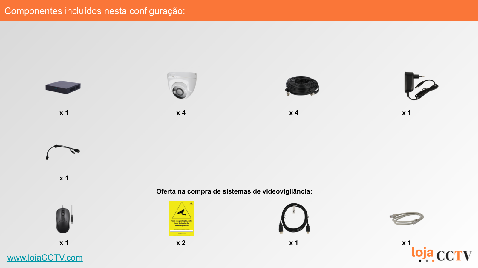 A configuração apresentada é ideal para a sua habitação, loja ou armazém. Com uma resolução de 2 mpx, cada câmara tem qualidade de imagem ideal para cobrir uma área até 25 m⊃2;. Se tiver áreas superiores, podemos alterar a configuração para incluir uma ou mais câmaras de resolução superior, ou temos outras configurações de sistemas completos disponíveis.
