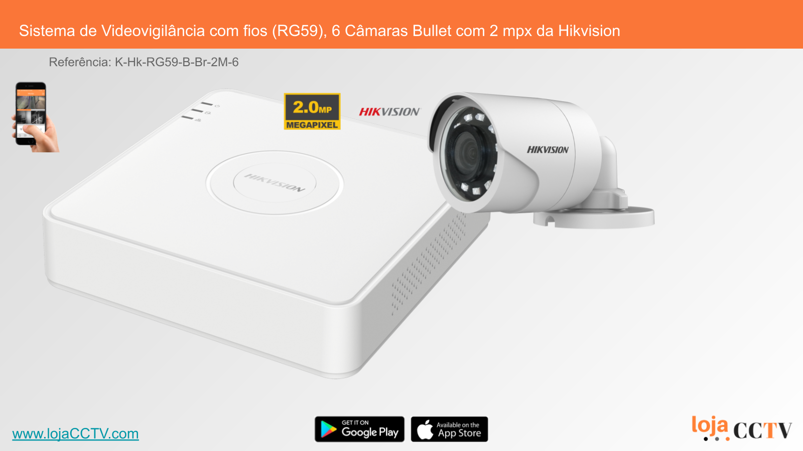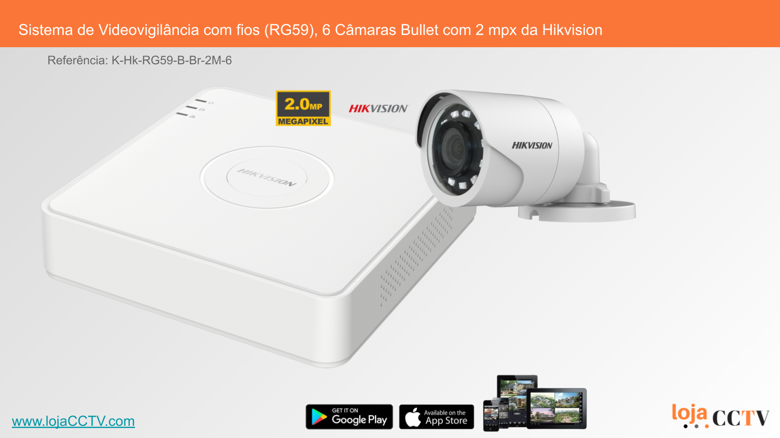 Sistema de Videovigilância com fios (RG59), 6 Câmaras Bullet com 2 mpx da Hikvision