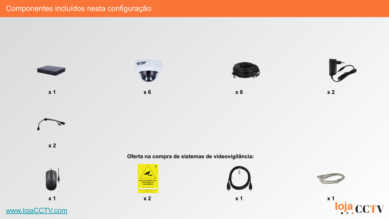 A configuração apresentada é ideal para a sua habitação, loja ou armazém. Com uma resolução de 5 mpx, cada câmara tem qualidade de imagem ideal para cobrir uma área até 50 m². Se tiver áreas superiores, podemos alterar a configuração para incluir uma ou mais câmaras de resolução superior, ou temos outras configurações de sistemas completos disponíveis.