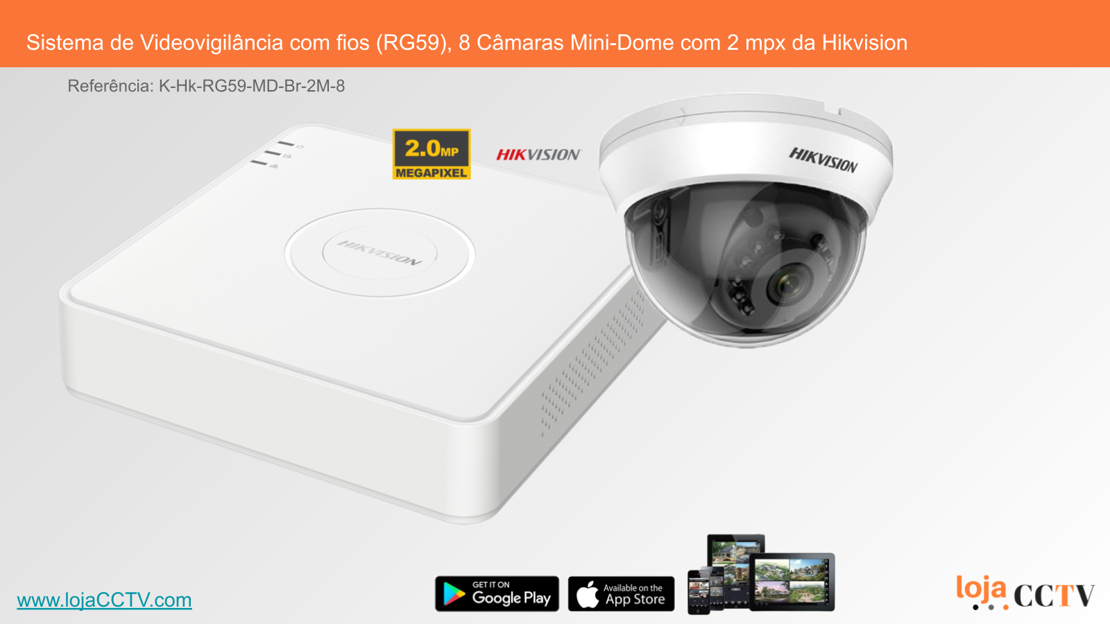 Sistema de Videovigilância com fios (RG59), 8 Câmaras Mini-Dome com 2 mpx da Hikvision