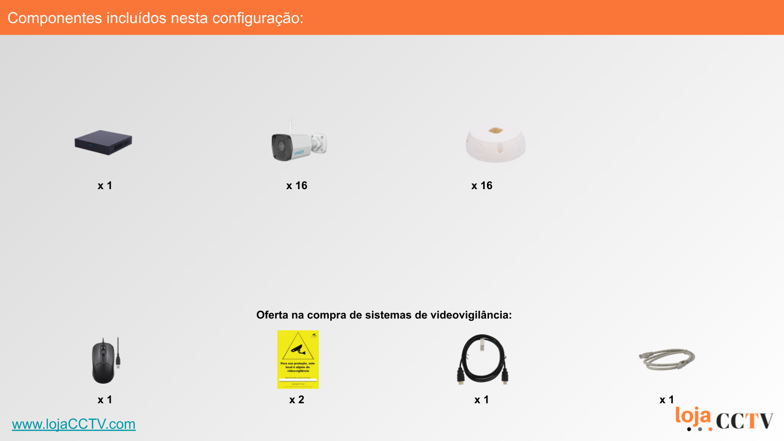 A configuração apresentada é ideal para a sua habitação, loja ou armazém. Com uma resolução de 2 mpx, cada câmara tem qualidade de imagem ideal para cobrir uma área até 25 m². Se tiver áreas superiores, podemos alterar a configuração para incluir uma ou mais câmaras de resolução superior, ou temos outras configurações de sistemas completos disponíveis.