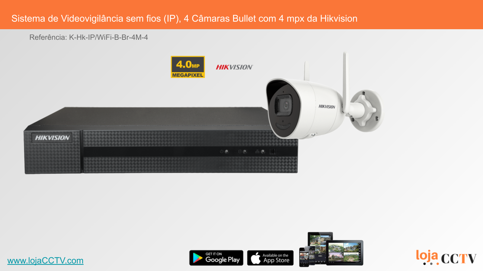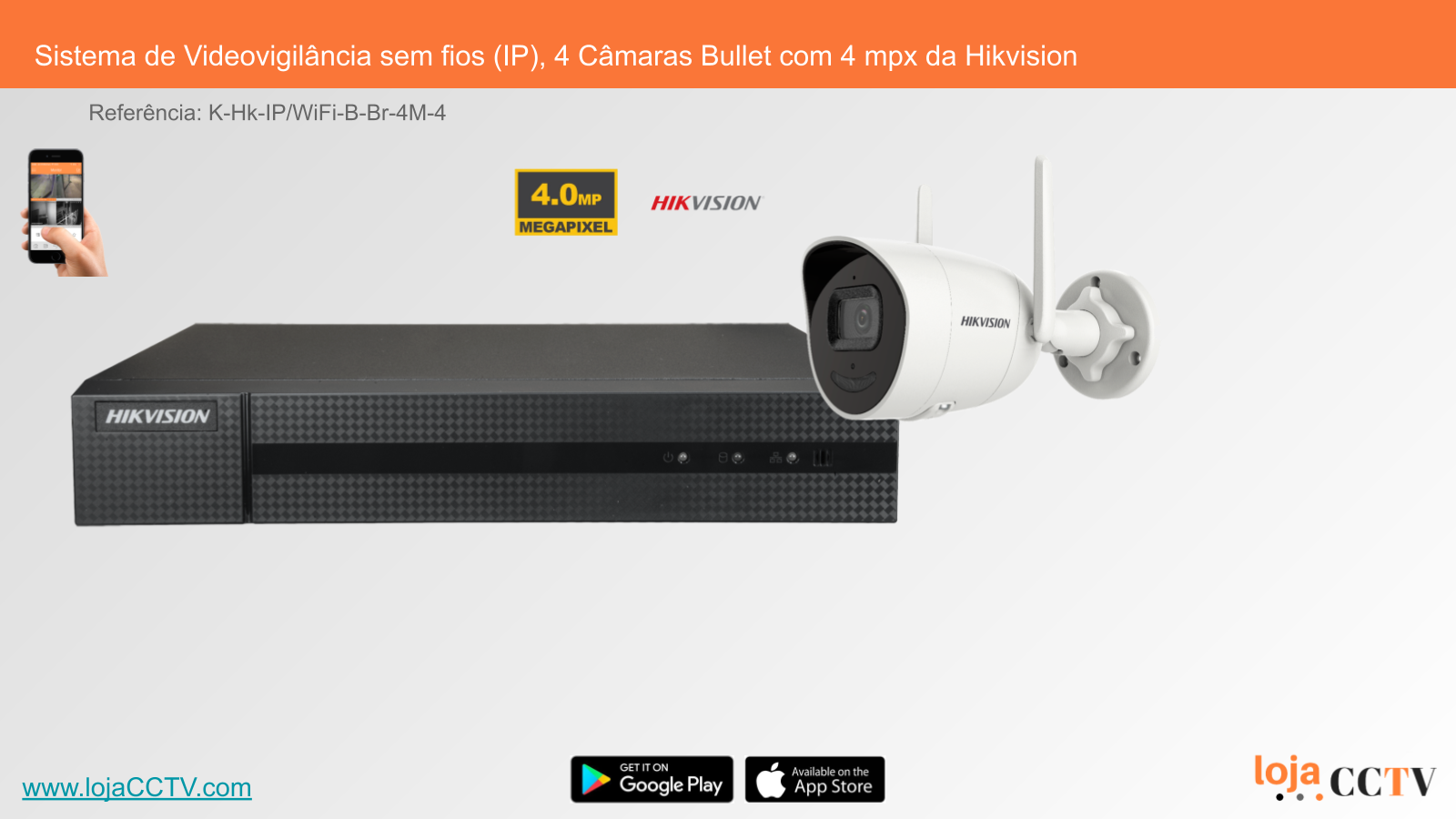 Conjunto de câmaras de vídeo vigilância configurado e pronto a usar, sem fios (IP), marca Hikvision, câmaras Bullet ideal para uso interno ou externo em paredes, tetos ou mastros.