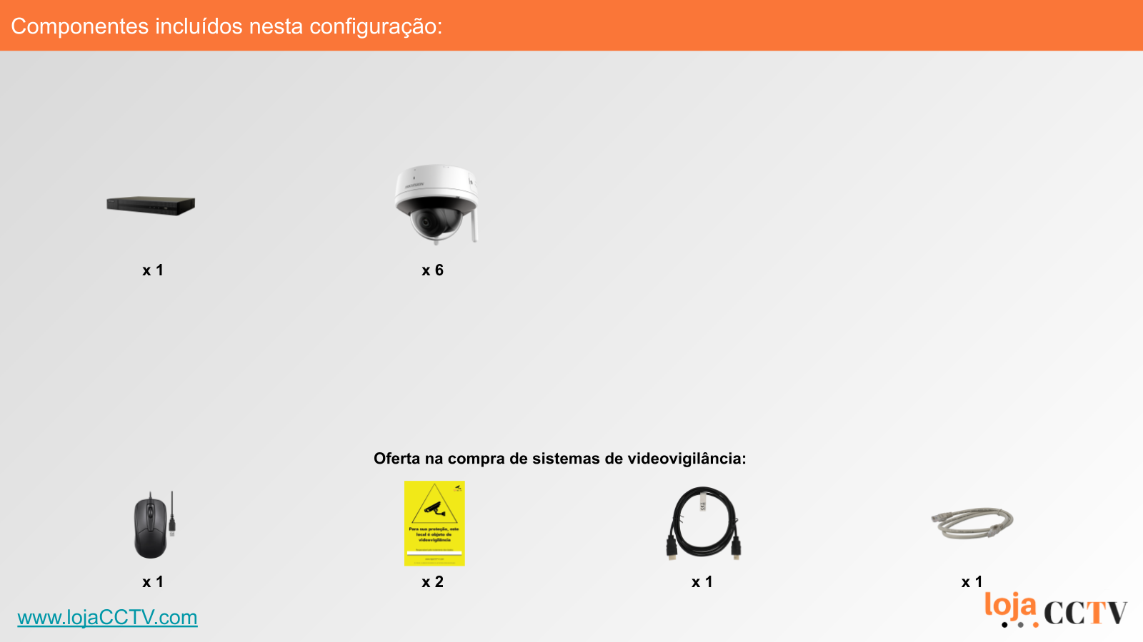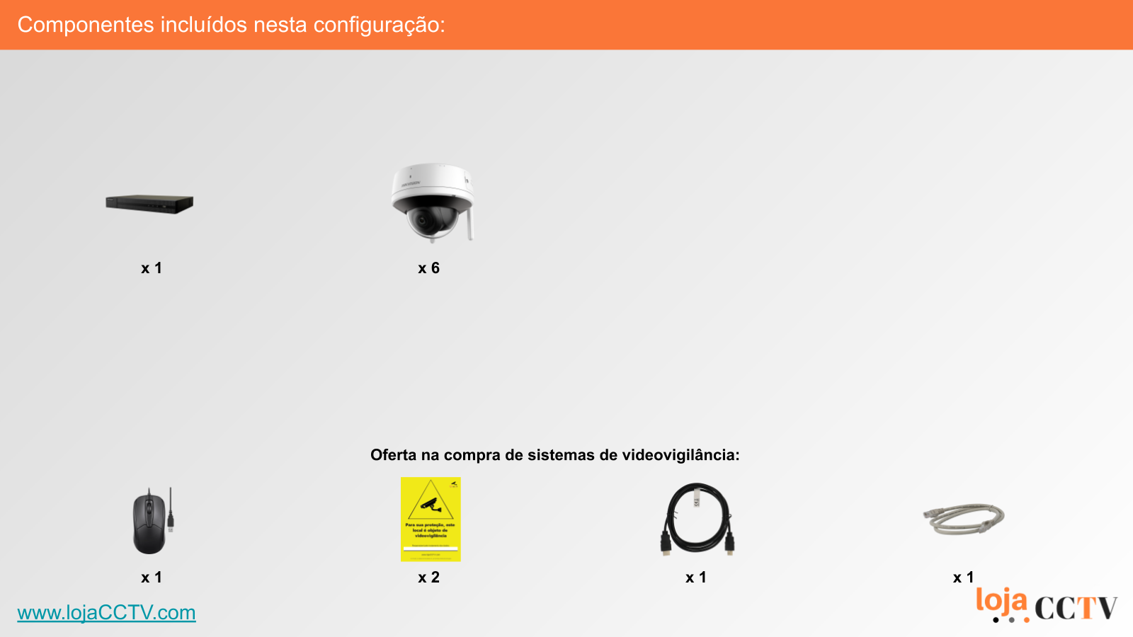 A configuração apresentada é ideal para a sua habitação, loja ou armazém. Com uma resolução de 4 mpx, cada câmara tem qualidade de imagem ideal para cobrir uma área até 50 m². Se tiver áreas superiores, podemos alterar a configuração para incluir uma ou mais câmaras de resolução superior, ou temos outras configurações de sistemas completos disponíveis.