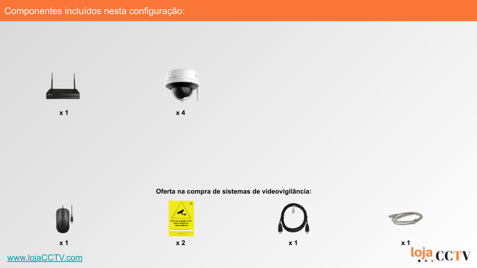 A configuração apresentada é ideal para a sua habitação, loja ou armazém. Com uma resolução de 4 mpx, cada câmara tem qualidade de imagem ideal para cobrir uma área até 50 m². Se tiver áreas superiores, podemos alterar a configuração para incluir uma ou mais câmaras de resolução superior, ou temos outras configurações de sistemas completos disponíveis.