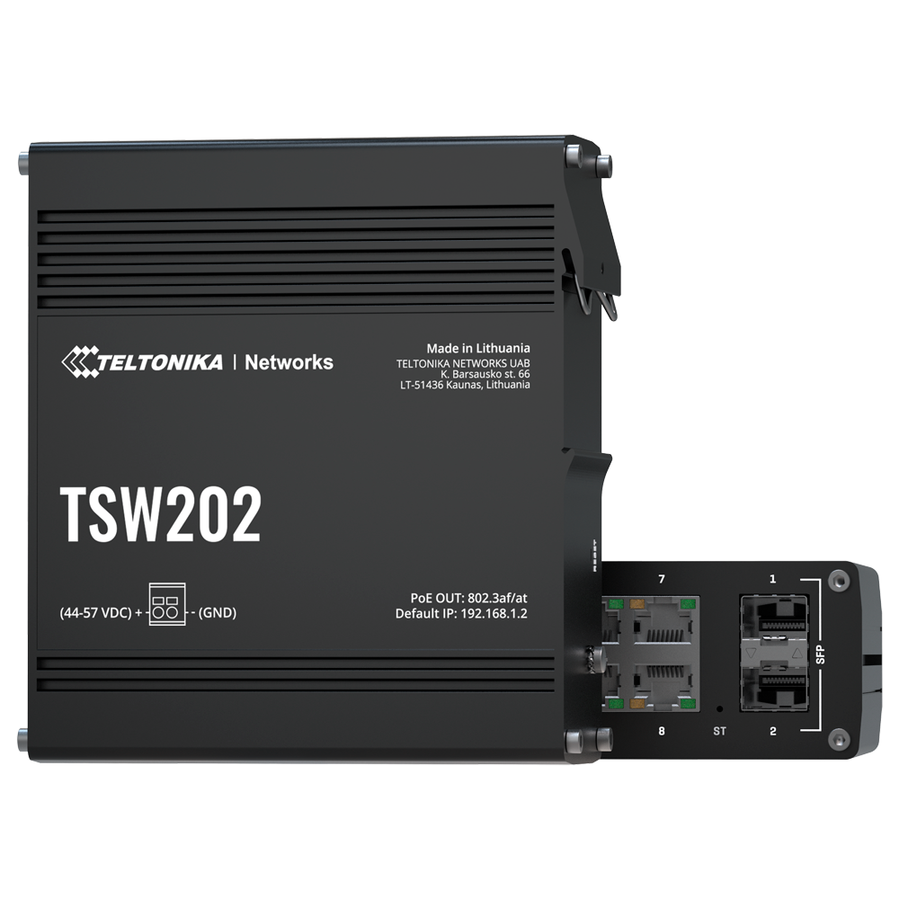 Home Switch PoE Gerenciável Teltonika Switch PoE Gestionável Industrial 8 portas Ethernet RJ45 Gigabit +2 SFP Gigabit 8 portas Ethernet PoE+ 802.3af/at-TK-TSW202 Teltonika Switch PoE Gestionável Industrial 8 portas Ethernet RJ45 Gigabit +2 SFP Gigabit 8 portas Ethernet PoE+ 802.3af/at-TK-TSW202 SKU: TK-TSW202 186,22 € 196,03 € Desconto de %. IVA incluído. Comprar Contactar Adicionar à wishlist Teltonika Switch PoE Gestionável Industrial8 portas Ethernet RJ45 Gigabit +2 SFP Gigabit8 portas Ethernet PoE+ 802.3af/atAté 30W por Porta PoEAté 240W de Pptencia POECaixa Robusta de AlumínioEspecificaçõesInterface:8 portas RJ45 10/100/1000 Mbps + 2 portas Gigabit SFPSistema Operativo:TSWOS (Baseado no OpenWRT)PoE:Portas 1~8 802.3af/at Até 30 W por portaCaracterísticas PoE:Conforme norma IEEE 802.3at PoE+ / IEEE 802.3af PoERAM:128MB, DDR3Armazenamento FLASH:16 MB serial flashVLAN:802.1Q até 4094Protocolos de redundância:Spanning Tree (STP, RTSP)DHCP:Ipv4 Servidor e Cliente / Ipv6 ClienteRouting:IPv4/IPv6 static routing, DHCPv6 client, static IPv6 addressQoS:Traffic Shaper Port-based shapingProtocolos de gestão:Web/Cloud/CLI/FOTAAlimentação:Consumo máximo 8W / 248W com PoEMaterial:Alumínio anodizadoTemp. funcionamento:-40º C ~ +75º CUmidade de funcionamento:10 ~ 90 % (sem condensação)Kit de montagem:Kit de montagem em superfície (opcional)Protecção:IP30Dimensões:44,2 (Al) x 132 (An) × 122,2 (Fo) mmPeso:610 g Partilhar