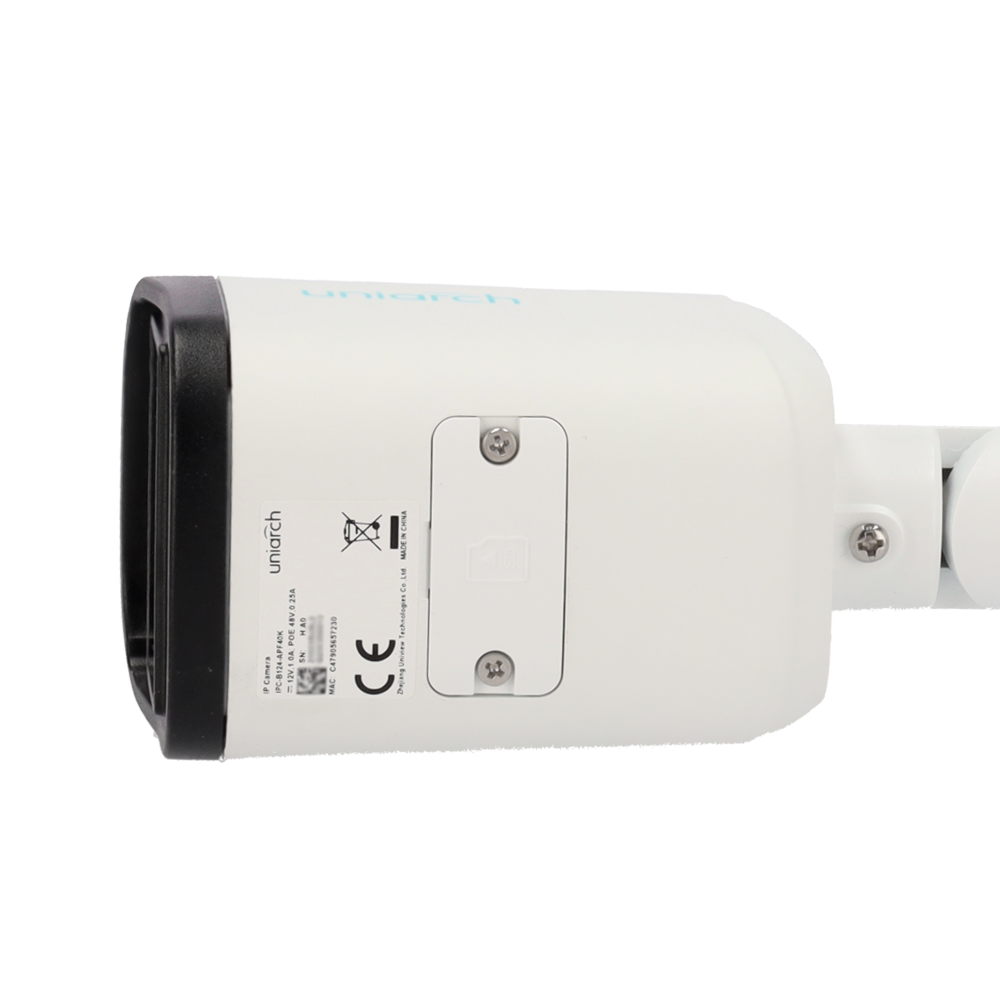 Câmara IP Bullet 4MP Uniarch UV-IPC-B124-APF40K é ideal para quem procura vigilância precisa com um ângulo de visão mais estreito, graças à lente fixa de 4.0mm — ideal para portões, entradas, corredores ou áreas de maior profundidade.