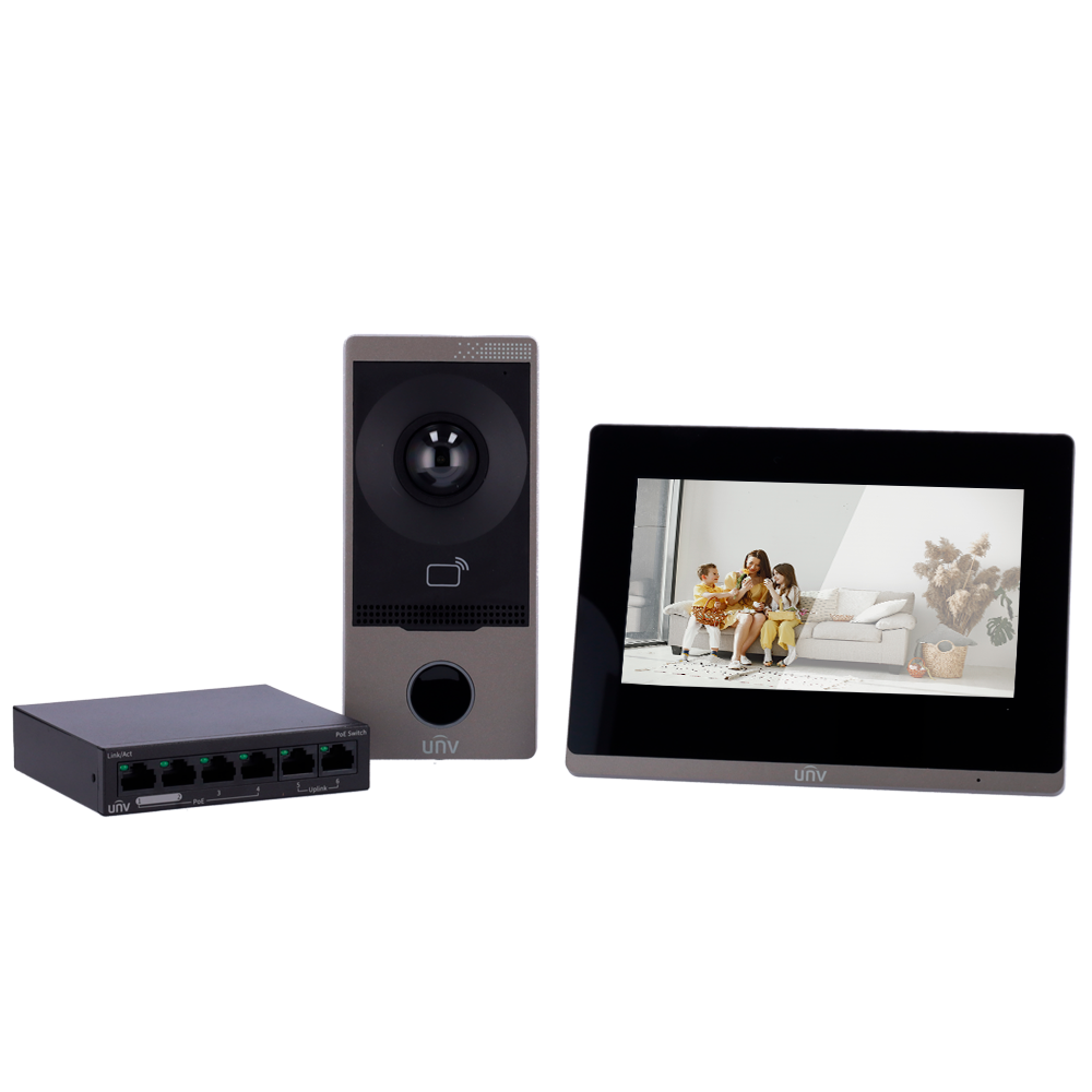 Kit de videoporteiro Uniview concebido para habitações e pequenas empresas que necessitam de uma solução moderna, fácil de instalar e com funcionalidades avançadas. Inclui painel exterior com câmara HD, monitor interior de 7" com controlo táctil e switch PoE para uma instalação simplificada.