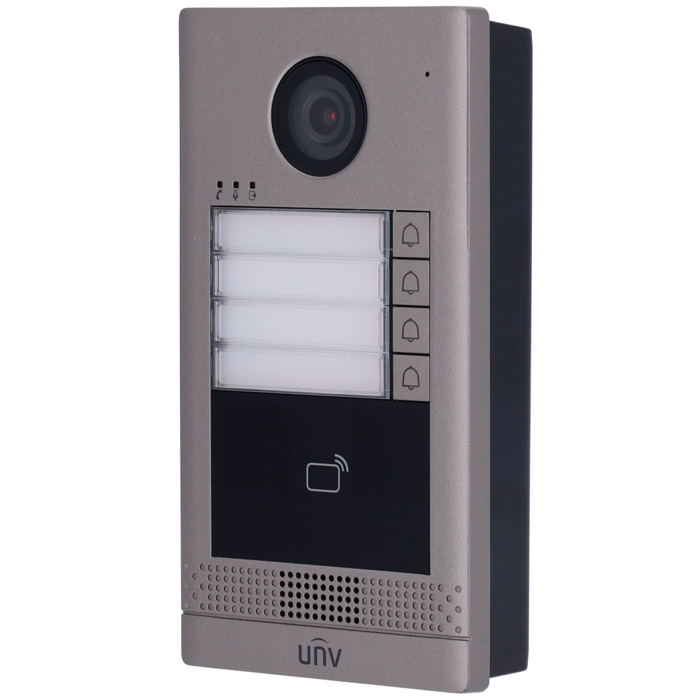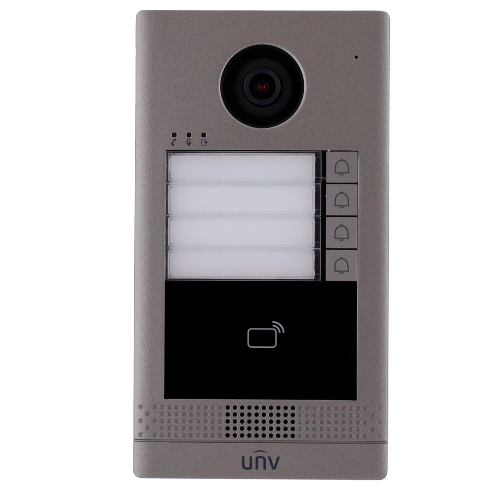 Placa exterior de videoporteiro Uniview para 4 apartamentos, com câmara 2 MP, ângulo amplo e botões de chamada individuais com etiqueta LED. Ideal para edifícios pequenos, permite abertura por cartão MF e monitorização remota via UNV-Link.